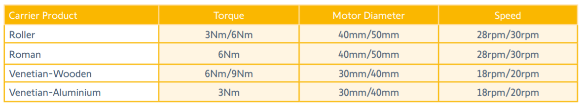 The carrier product such as Roller blind, Roman blind… etc, weight of the blind, and the size of head rail varies. It affects the motor torque which is the weight carrying capacity, diameter, and speed that can be selected.