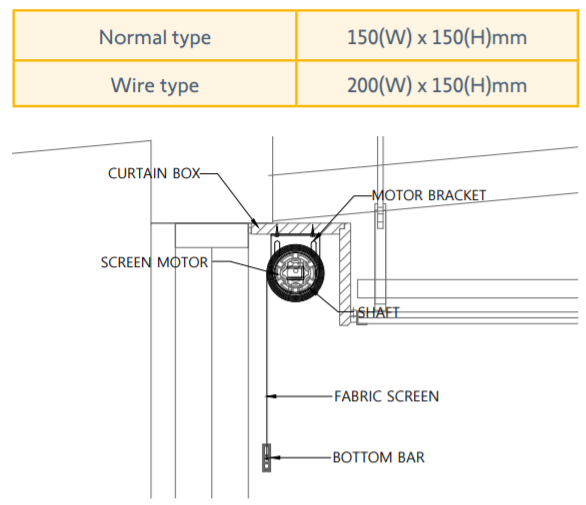 Basically, it depends on shaft diameter by window height. Wire type roll screen requires more space for wire installation. In that case, the shaft is thicker than normal type, hence a bigger pelmet is needed with thick shaft for tall windows.