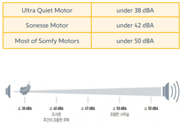 Most of Somfy motors for internal blind is below 50dBA. It is almost lower than the noise of a quiet office. Sonesse motor, which is the most famous of Somfy product, is as quiet as library or a quiet house at 42dBA of noise level. Somfy also has Ultra Quiet motor which is very silent by far reaching as low as 38dBA.